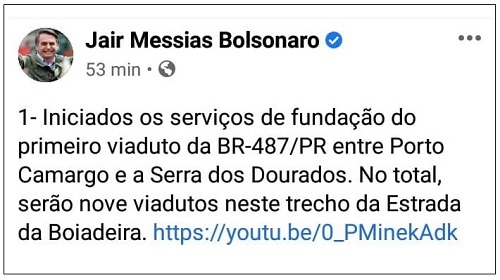 O presidente Jair Bolsonaro citou a Estrada Boiadeira em postagem no Twitter nesta segunda-feira à tarde. Disse que foi iniciada a fundação do primeiro viaduto entre Porto Camargo e a Serra dos Dourados. "No total, serão nove viadutos neste trecho da Estrada da Boiadeira", explicou. O tuíte inclui link para ver um vídeo das obras no Youtube.