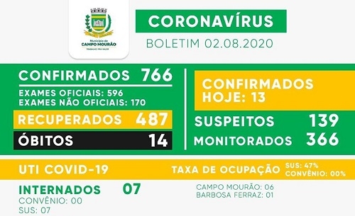 Assim como sábado, o domingo teve 13 novos casos confirmados de coronavírus em Campo Mourão. O total foi a 766. Houve 14 recuperados e eles agora são 487. Há 265 mourãoenses com o vírus no momento.