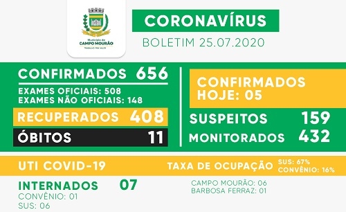 O boletim Covid deste sábado em Campo Mourão voltou a mostrar mais pessoas recuperadas da covid (16) do que novos casos (5). Agora são 656 casos e 408 recuperados. Só que o número de suspeitos aumentou bem, de 114 para 159, ou seja, mais 45 em 24 horas.