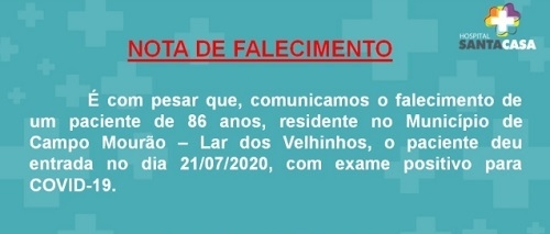 A Santa Casa de Campo Mourão confirmou nesta segunda-feira a quarta morte de interno do Lar dos Velhinho por coronavírus. O paciente tinha 86 anos e estava internado desde o dia 21. O total de óbitos do município foi a 15. Em toda a região agora são 53 mortes em 16 cidades.