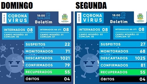 Mais dois casos de covid-19 foram confirmados nesta segunda-feira em Campo Mourão. Agora são 81 desde o início da pandemia, sendo que 55 estão recuperados. O boletim também mostra aumento de 22 para 27 no número de suspeitos Já as internações não mudaram em relação ao domingo - oito na enfermaria (três de Campo Mourão) e oito na UTI (um mourãoense).