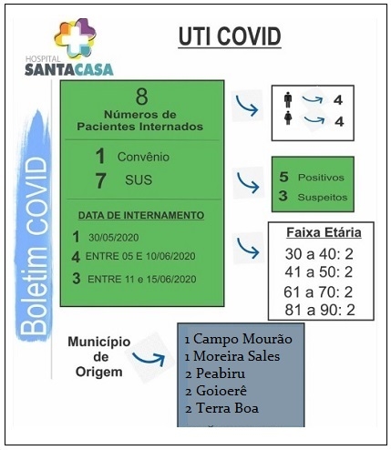 Boletim divulgado pela Santa Casa de Campo Mourão, nesta segunda-feira, mostra com detalhes e de forma bem clara, como está a UTI Covid da instituição. Dos 15 leitos, oito estão ocupados.