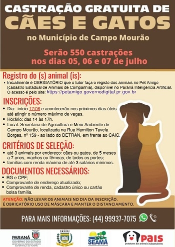 Através do Castramóvel, 505 cães e gastos serão castrados em Campo Mourão nos dias 5, 6 e 7 de julho. É de graça. As inscrições começam nesta quarta-feira, na Seama. Mas atenção que há algumas regrinhas. Confira: