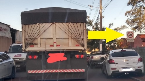 Carreta passa por rua do jardim Albuquerque, em Campo Mourão. À direita a placa não deixa dúvida: caminhões não são permitidos por ali.