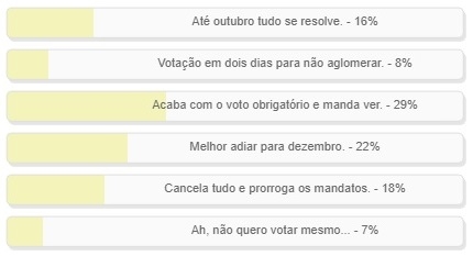 Para 22% é melhor adiar para dezembro e para 18% a eleição deve ser cancelada e os mandatos prorrogados.