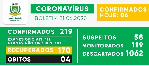 Seis casos de covid foram confirmados neste domingo em Campo Mourão. O total desde o início da pandemia foi a 219, sendo 112 por exames oficiais e 107 por não-oficiais. Os casos recuperados subiram de 163 para 170. Os suspeitos diminuíram de 61 para 58.
