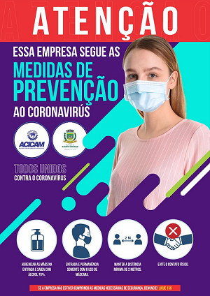 Empresas de Campo Mourão comprometidas com o combate à covid-19 estão sendo identificadas com cartazes distribuídos pela Acicam. A entidade lembra que a empresa tem a responsabilidade de adotar as medidas e a obrigação de exigir que os clientes adotem os cuidados indicados.