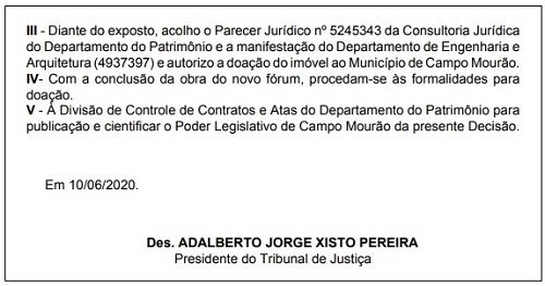 O Tribunal de Justiça do Paraná confirmou que vai doar o atual fórum de Campo Mourão para a prefeitura.