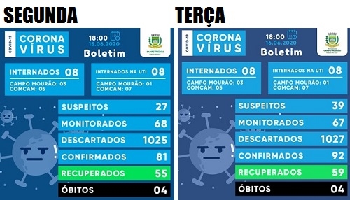 Onze casos de coronavírus foram confirmados em Campo Mourão nas últimas 24 horas. Um recorde desde o início da pandemia. A cidade foi a 92 casos confirmados, 39 apenas este mês. O boletim desta segunda-feira também mostra que aumentaram de 27 para 39 os casos suspeitos. Menos mal que não subiu o número de internações. De bom, quatro casos recuperados. Agora são 59.