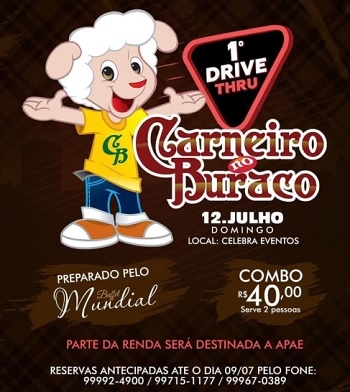 Festa do Carneiro no Buraco não tem este ano. Impossível. Mas Campo Mourão terá o 1° Carneiro no Buraco Drive Thru. A ideia é do buffet Mundial. Vai custar R$ 40 (duas pessoas). Será no dia 12 de julho, segundo domingo de julho, como manda a tradição. Quem quiser tem de reservar até o dia 9. Parte da renda será destinada à Apae. A entrega acontecerá no Celebra.