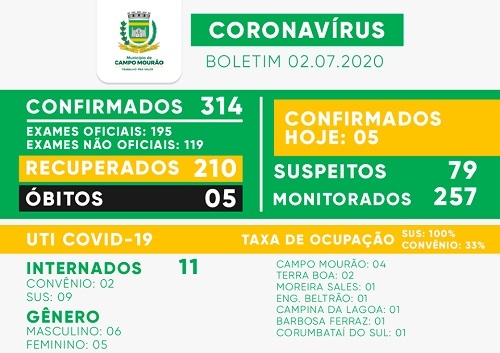 Mais cinco casos de covid foram confirmados nesta quinta-feira em Campo Mourão. O total, entre exames oficiais e não oficiais, foi a 314. O número de casos suspeitos caiu de 100 para 79. Não houve alteração entre os casos recuperados (210).