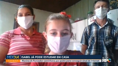 Lembra de Isabel Cravicz, a menina de 10 anos, de Roncador, que virou matéria na RPC/Globo por montar uma barraca para poder estudar onde tinha sinal de wi-fi? Ela voltou à emissora neste sábado. Agora porque uma empresa doou a rede de internet e um ano grátis de sinal para a família dela. Isabel mora na zona rural e precisava ir a uma proriedade vizinha para acompanhar, com wi-fi emprestado, as aulas à distância.
