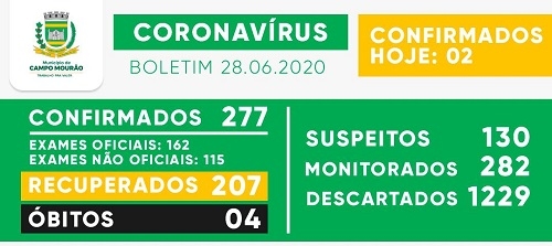 Dois novos casos de coronavírus foram confirmados neste domingo em Campo Mourão, ambos em exames oficiais. Pouco em relação aos últimos dias. O total no município foi a 277 (162 oficiais e 115 não-oficiais). Houve mais cinco casos recuperados e o total foi a 207. O número de suspeitos também subiu. Foram mais 14, indo de 116 para 130.