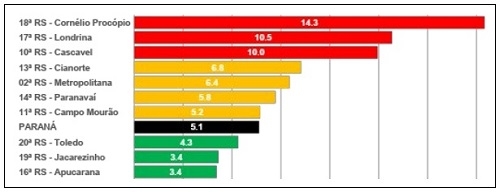 Sétimo lugar - A 11ª Regional de Saúde tem 5,2 mortes por 100 mil habitantes. É o sétimo maior índice do Estado. As regionais com maiores índices são Cornélio Procópio (14,3), Londrina (10,5), Cascavel (10), Cianorte (6,8), Metropolitana (6,4) e Paranavaí (5,8).