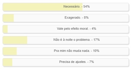 Enquete com essa pergunta teve votação encerrada neste domingo. Venceu a alternativa "Necessário", com 54% dos votos. Ou seja: Nem precisa de segundo turno. Para 17% "Não é à noite o problema" e para 10% "Pra mim não muda nada". O resultado completo está no quadro acima.