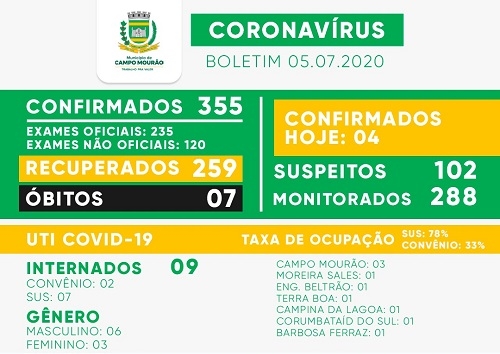 Quatro casos de coronavírus foram confirmados neste domingo em Campo Mourão. O total foi a 355. Os suspeitos foram de 90 para 102. O domingo também teve 12 recuperados e total foi a 259.