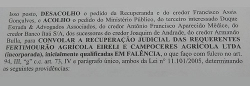 "(A Fertimourão) Reafirma sua certeza de que, com base na legislação brasileira, a solução apresentada não corresponde aos melhores interesses de todos os credores da empresa, o que seria melhor atendido pela manutenção de suas atividades no escopo de um novo plano de recuperação".