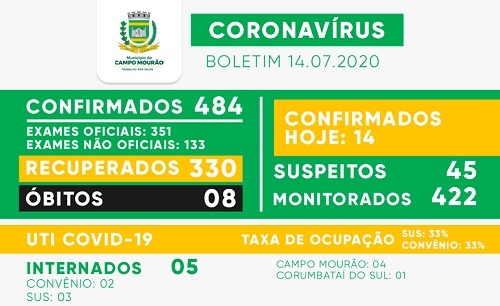 Novos casos - Campo Mourão confirmou mais 14 casos de coronavírus nesta terça-feira. O total foi a 484. Houve mais 10 recuperados e eles agora são 330. O número de suspeitos caiu bem, de 93 para 45.