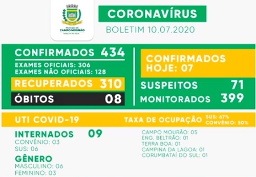 Novos casos - Sete novos casos foram confirmados nesta sexta-feira em Campo Mourão. O total foi a 434. Também houve sete recuperações. Agora são 310. O número de casos suspeitos subiu de 55 para 71.