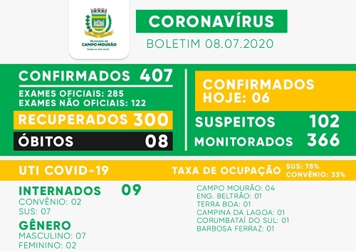 Campo Mourão registrou mais seis casos de coronavírus nesta quarta-feira. O total foi a 407. Os recuperados no dia foram 15, totalizando 300 desde o início da pandemia. O número de casos suspeitos subiu de 86 para 102.