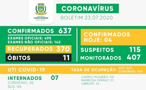 O boletim Covid desta quinta-feira em Campo Mourão apresenta mais pacientes recuperados (10) do que novos casos (4) em relação ao dia anterior. O total de confirmações foi a 637 e de recuperações a 370. Já o número de casos suspeitos aumentou de 101 para 115.