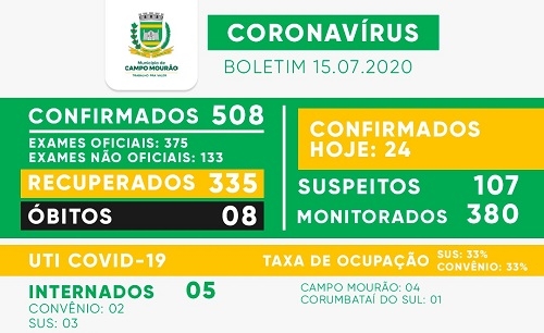 Campo Mourão registrou mais 24 casos de covid-19 nesta quarta-feira. O total desde o início da pandemia foi a 508. Houve mais cinco recuperados e eles agora são 335. O número de casos suspeitos subiu bastante, de 45 para 107, ou seja, mais 62 num único dia.