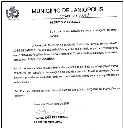 Mais uma prefeitura da região aderiu à "moda" de permitir multas por fotos postadas em redes sociais. Desta vez foi Janiópolis. O prefeito Ismael Dezanoski assinou decreto específico para isso. É bem simples e direto, com apenas dois artigos. O objetivo é fiscalizar o uso de máscaras, festas e aglomerações. Dezanoski alega, entre outas coisas, que a equipe de fiscalização é pequena. E o Facebook está aí, uai!...