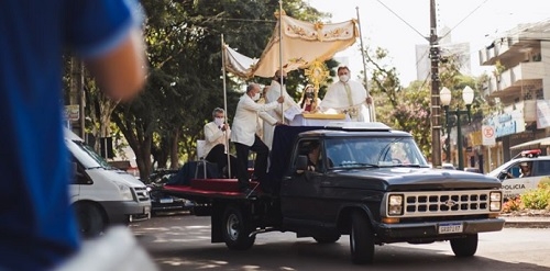 Corpus Christi diferente este ano por conta da covid-19. Nada de ruas enfeitadas nem de procissões a pé. Ao invés disso, carreatas. Em Campo Mourão, o bispo d. Bruno Versari celebrou missa na Catedral e em seguida subiu na carroceria de uma F-1.000, que puxou a fila da carreata até a igreja ucraniana.