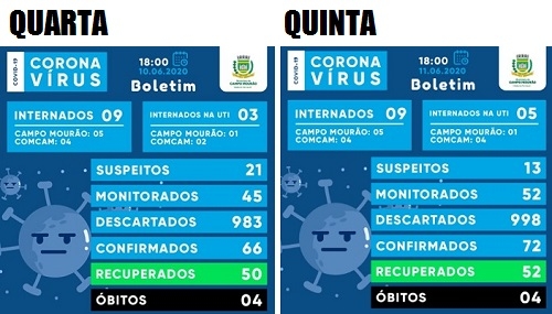 Subiu para 72 o número de casos confirmados de coronavírus em Campo Mourão. Foram seis apenas nesta quinta-feira. E já são 19 este mês. Houve mais dois recuperados e agora são 52. Os casos suspeitos caíram de 21 para 13. As internações na enfermaria não mudaram. São nove (cinco de Campo Mourão). Na UTI os leitos ocupados foram de três para cinco (quatro pacientes da região).