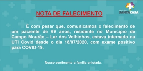 A Santa Casa confirnou nesta terça-feira a morte de um homem de 69 anos por coronavírus. Foi o 10° interno do Lar dos Velhinhos a morrer de covid. Ele estava internado desde o último dia 18. Outra vítima de Campo Mourão foi uma mulher de 75 anos, que estava internada em Sarandi. O número de mortes pelo vírus foi no município foi a 23. Em toda a região são 67.