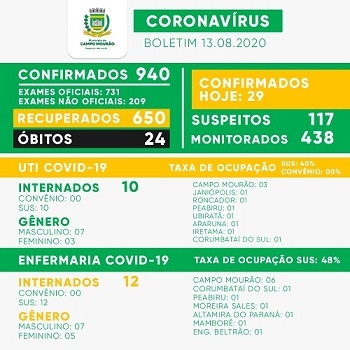 Campo Mourão confirmou mais 29 casos de covid-19 nesta quinta-feira. O total foi a 940. O número mostra uma semana "gangorra", com muitos casos confirmados num dia e "poucos" no outro. Houve 30 recuperados e eles agora são 650. Os mourãoenses com o vírus no momento são 266.