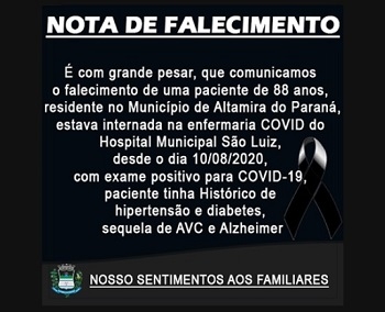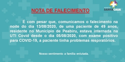 A Santa Casa de Campo Mourão confirmou nesta sexta-feira a morte por covid de uma mulher de 49 anos que morava em Peabiru. Ela estava internada desde o último dia 5. Foi o terceiro óbito do município, que tem 94 casos confirmados da doença (63 recuperados). Na região agora são 73 mortes por coronavírus.