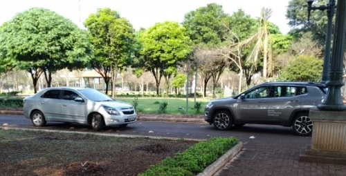 Carro (o claro) passa pela contramão no trecho da rua Brasil que atravessa as praças centrais de Campo Mourão.