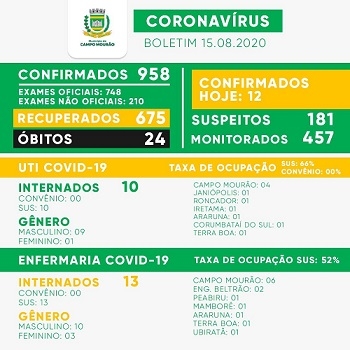 Mais 12 casos de coronavírus foram confirmados neste sábado em Campo Mourão, que foi a 958 no total.