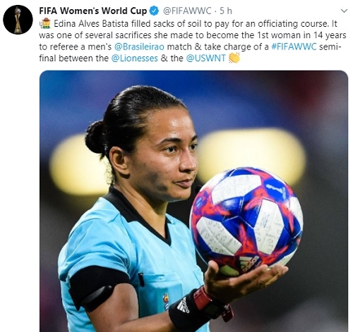 A Fifa fez postagem no Twitter, nesta sexta-feira, sobre a árbitra Edna Alves, de Goioerê. Diz que ela trabalhou enchendo sacos de terra para poder pagar o curso de arbitragem e que esse foi um dos sacrifícios que fez para se tornar a primeira mulher, em 14 anos, a apitar jogos do Brasileirão. Também lembra que ela comandou, ano passado, uma das semifinais da Copa do Mundo Feminina (EUA x Inglaterra).