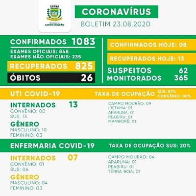 Onde? - Os novos casos foram em Campo Mourão 8, Engenheiro Beltrão 6, Goioerê 2, Janiópolis 2, Peabiru 2 e Ubiratã 3.
