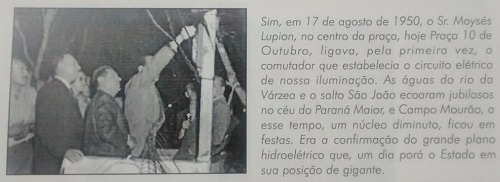 17 de agosto de 1950. Completa 70 anos nesta segunda-feira que a luz elétrica chegou a Campo Mourão. Foi inaugurada pelo governador Moysés Lupion em solenidade na praça 10 de Outubro (atual Getúlio Vargas), mais precisamente onde hoje está o terminal de ônibus e o colégio Santa Cruz. O registro acima é do livro "Campo Mourão - Centro do Progresso", de Pedro da Veiga, já citando reportagem do jornal Correio do Noroeste.