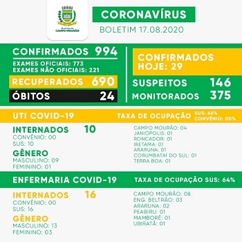 Faltam apenas seis casos de covid-19 para Campo Mourão atingir mil confirmações. Nesta segunda-feira foram mais 29 e o total chegou a 994. Houve sete recuperados e eles agora são 690. Os moradores de Campo Mourão com o vírus ativo, no momento, são 280.