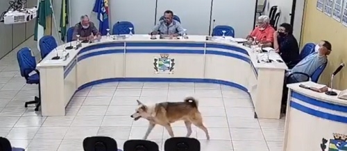 O clic é da sessão da Câmara de Vereadores de Janiópolis, realizada nesta segunda-feira à noite. O acesso ao público está restristro por causa da pandemia, mas nada impede a presença de animais, como o cachorro que ficou passeando pelo plenário durante boa parte da reunião. O cão cumpriu o regimento e não se manifestou verbalmente, ou seja, não latiu durante os trabalhos.