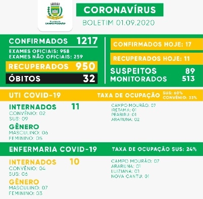 O Boletim Covid desta terça-feira registra a 32ª morte pela doença em Campo Mourão. A vítima foi uma mulher de 73 anos que estava internada na Santa Casa. O dia teve mais 17 casos confirmados e 11 recuperados. Os totais foram a 1.217 e 950 respectivamente. Os mourãoenses com o vírus ativo são 235.