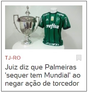 Aquela história do juiz que escreveu na sentença que o Palmeiras "sequer mundial tem" continua repercutindo. Nesta quarta-feira foi destaque no portal UOL, com direito a chamada na página inicial e tudo. O caso foi em Ji-Paraná/RO, mas o juiz Maximiliano Darci David Deitos é de Campo Mourão. Trata-se de filho do ex-deputado Darcy Deitos.