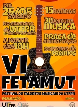 1) A UTFPR de Campo Mourão realiza neste sábado (18h) o 6º Festival de Talentos Musicais - Fetamut. Vão participar 15 bandas formadas por alunos, ex-alunos e servidores. O evento é gratuito e aberto à comunidade.