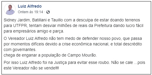 Motivo? Como tinha avisado, Luiz Alfredo entrou com ação contra o projeto que doa área para a UTFPR.