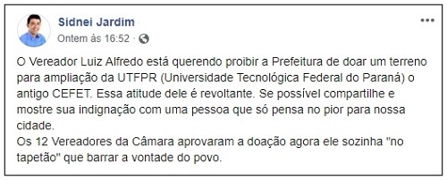 Sidnei Jardim disse que Luiz Alfredo quer proibir a prefeitura de doar o terreno para ampliação da UTFPR.