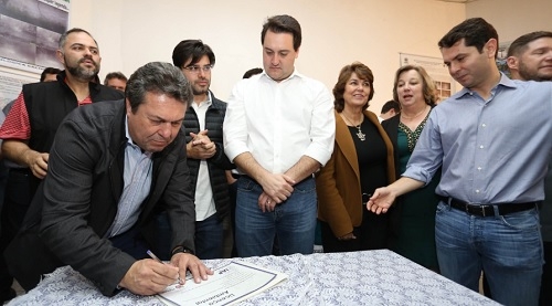 O que é que o secretário Márcio Nunes (Desenvolvimento Sustentável) está assinando em Pitanga ao lado do governador Ratinho Jr? É a licença ambiental da área do futuro Hospital Regional da cidade. O prédio será construído nos próximos meses e terá centro especializado para urgências e cirurgias. Ratinho Jr participou de reunião da Amocentro, nesta sexta-feira, em Pitanga.
