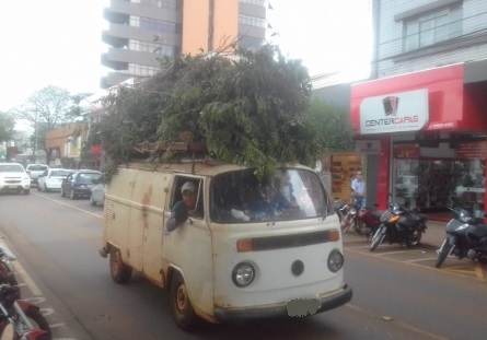 Não tem uma camionete para transportar os restos de poda? Isso não é problema para quem tem uma Kombi com bagageiro. Essa aí foi flagrada no centro de Campo Mourão. Ivo Quennehem (QI TV)