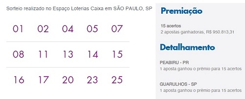 Um aposta feita em Peabiru foi uma duas duas ganhadoras da Lotofácil sorteada nesta segunda-feira.