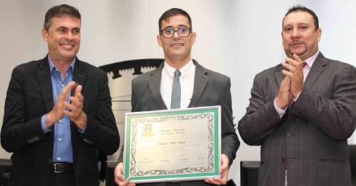 A Câmara de Campo Mourão entregou nesta terça-feira o titulo de Cidadão Honorária ao médico Danilo Leão Souza. Ele está há seis anos na cidade. É especialista em saúde da família e atende no posto do jardim Paulista, além de plantões no 24h. A homenagem foi entregue pelo vereador-autor, Tucano Ribeiro, e pelo vice-prefeito Beto Voidelo. "Agora sou um autêntico mourãonese", frisou Souza no discurso.
