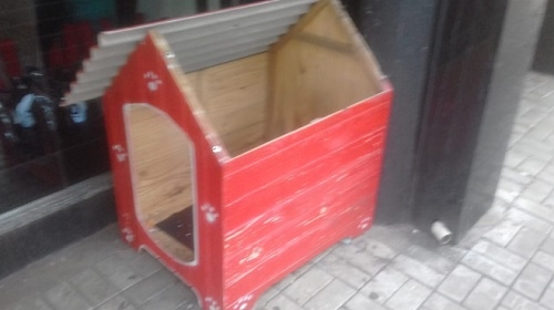 Casinha para cães de rua colocada no calçadão de Campo Mourão por lojista amanheceu sem parte do telhado. Ivo Quennehem (QI TV)