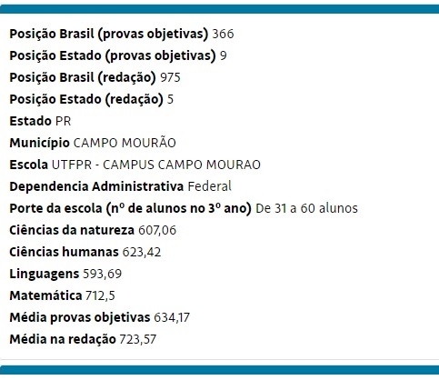 O jornal Folha de S. Paulo fez um ranking com as notas do Enem 2017 de escolas de todo o País. Só foram incluídas escolas com pelo menos 50% dos alunos fazendo as provas e mínimo de 10 estudantes. A classificação é sobre as provas objetivas (sem a redação). Da região foram avaliadas 20 escolas públicas - nove de Campo Mourão e 11 da região.